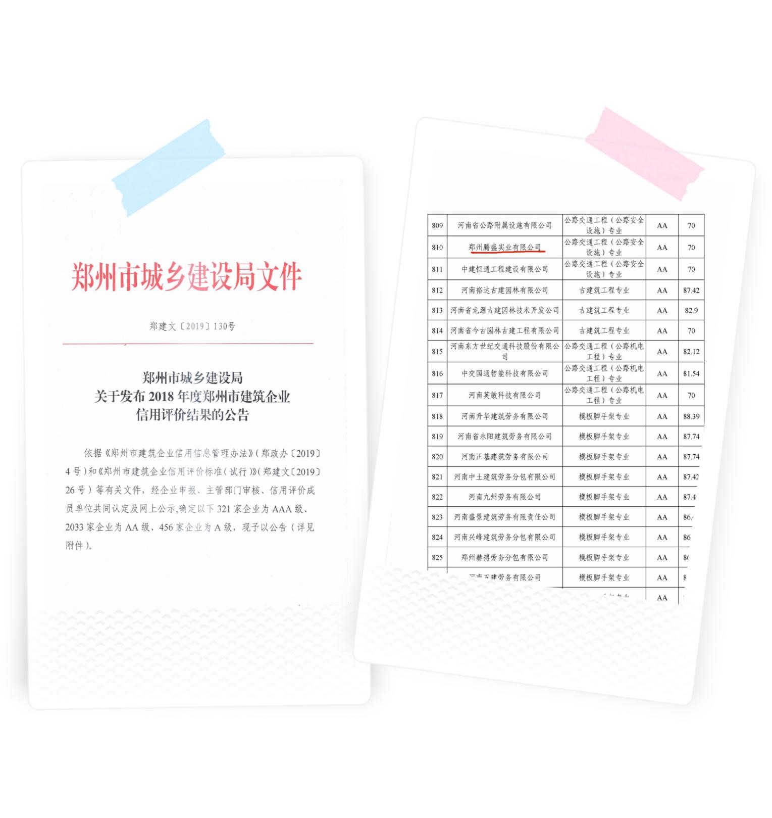 在做好施工管理的同時(shí),按照上級(jí)行政主管部門要求,認(rèn)真上報(bào)公司年度工程施工信息、稅收繳納等企業(yè)基本信息。根據(jù)鄭建文【2019】130號(hào)關(guān)于《2019年鄭州市城鄉(xiāng)建設(shè)局關(guān)于發(fā)布2018年度鄭州市建筑企業(yè)信用評(píng)價(jià)結(jié)果的公告》,我公司評(píng)為鄭州市企業(yè)單位建筑企業(yè)AA信用等級(jí),這是對(duì)我公司在建筑企業(yè)信用中表現(xiàn)良好的肯定,更是對(duì)接下來(lái)對(duì)我公司的發(fā)展提出更高標(biāo)準(zhǔn)的要求。