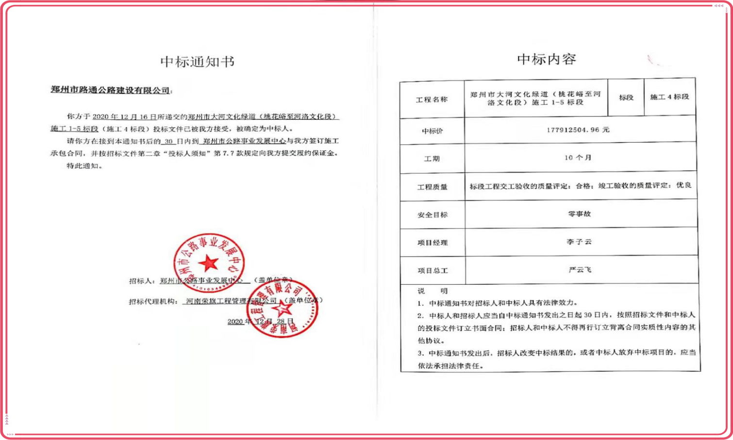 2021年1月15日,在新年到來之際,公司正式收到鄭州市公路事業(yè)發(fā)展中心發(fā)來的《鄭州市大河文化綠道(桃花峪至河洛文化段)施工四標(biāo)段》中標(biāo)通知書,中標(biāo)金額1.77億元。這是我公司2020年度中標(biāo)金額最高的項(xiàng)目。